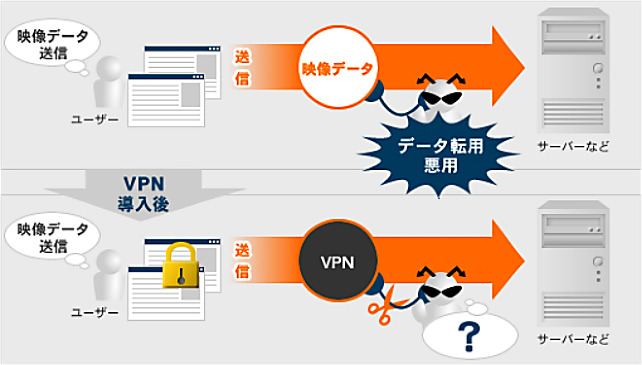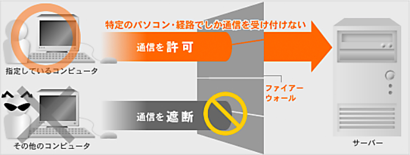 予め指定しておいたコンピュータや経路以外からの通信を遮断・または許可する設定を行い ます。 また、VPN(仮想ネットワーク)設定を施すことによってインターネットに流れる映像データなど を第三者から盗聴されることを防ぎます。