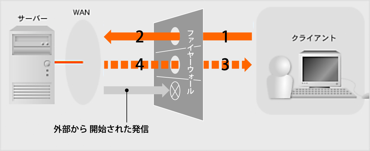 前述のパケットフィルタリングではデータの返りのポートが常時開放されてしまうことがあるので、十分なセキュリティ対策ではないと説明いたしました。
